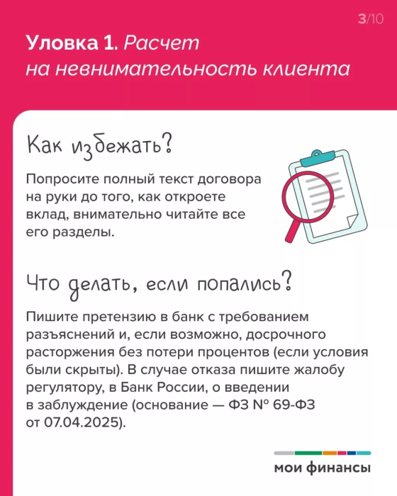 Попросите полный текст договора на руки до того, как откроете вклад. Внимательно читайте все разделы, в том числе об условиях начисления процентов и о возможных штрафных санкциях.