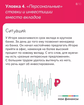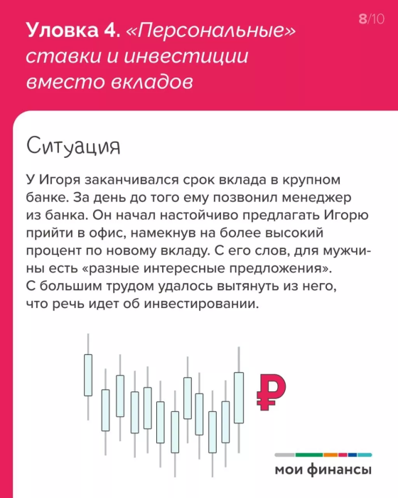 Несовпадение рекламы (устных обещаний) и фактических условий. Вы слышите фразы типа «акция закончилась» или «этот процент только с инвестициями/страховкой». Либо предлагают в качестве альтернативы депозитам различные инвестиционные продукты, которые «лучше, чем вклад». Одно дело — информировать о существовании подобных продуктов, другое — оказывать давление.