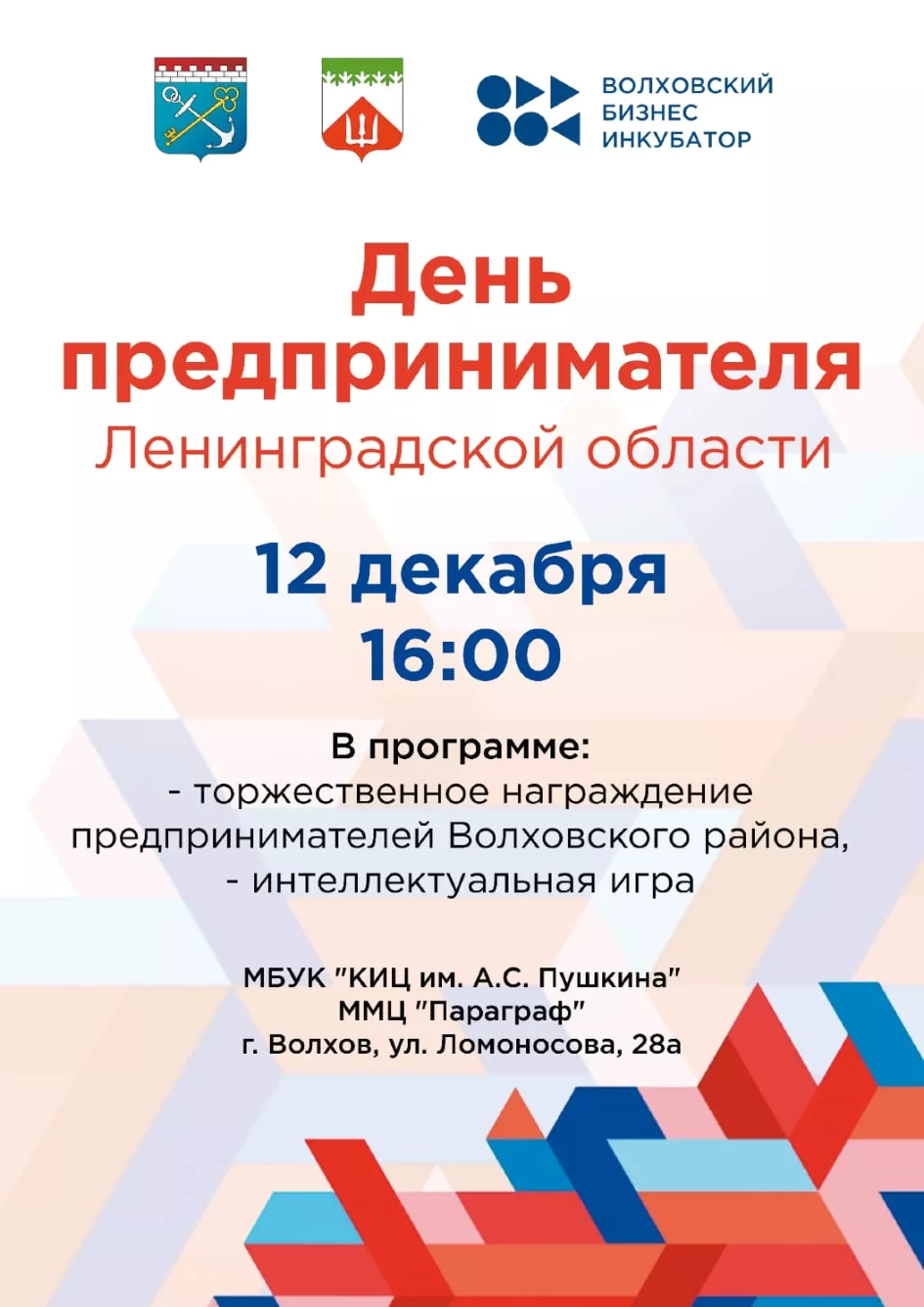 Приглашаем вас принять участие в мероприятии, посвящённом Дню предпринимателя Ленинградской области, которое состоится 12 декабря 2025 года в 16:00 по адресу: г. Волхов, ул. Ломоносова, 28, МБУК «КИЦ» им. Пушкина.