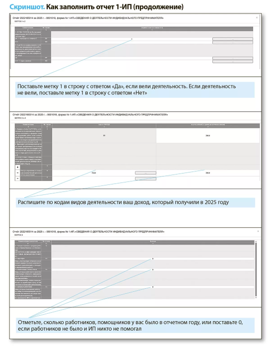 Поставьте метку 1 в строку с ответом «Да», если вели деятельность. Если деятельность предприниматель не вел в отчетном периоде, поставьте метку 1 в строку с ответом «Нет» (шаг 4). Распишите по кодам ОКВЭД полученный доход индивидуального предпринимателя за 2025 год (шаг 5).
