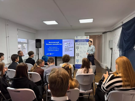 Сотрудники Волховского Бизнес-Инкубатора в лице помощника руководителя Павлова А.А., начальника сектора обучения и консультаций Лобанова М.С., а также экономист администрации Новоладожского городского поселения Есенина Н.Г. и действующий предприниматель Рязанова С.О. провели презентацию об актуальности ведения предпринимательской деятельности в Волховском районе, об особенностях, преимуществах и сложностях этой профессии, существующих мерах государственной поддержки начинающим предпринимателям.